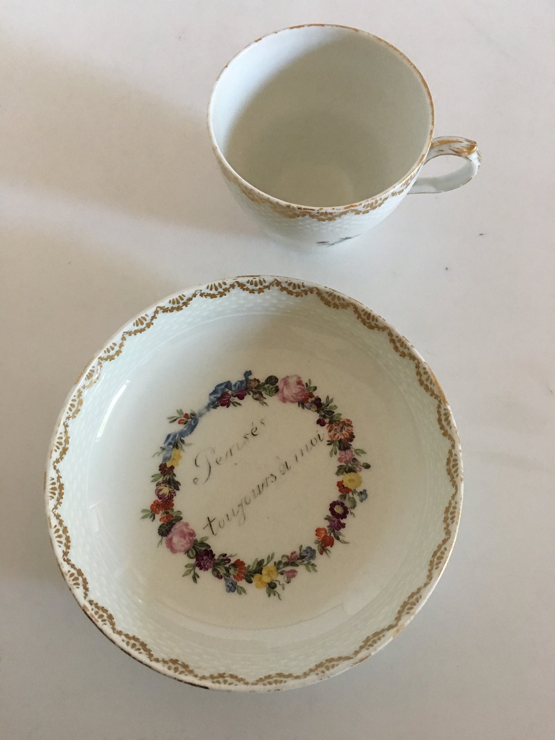 Antik Royal Copenhagen kop og underkop med indskription fra 1790-1810. Med fransk indskription: Tænk altid på mig
