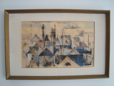 Pastel af Poul Møller - Vue ud over hustage og master 1972.