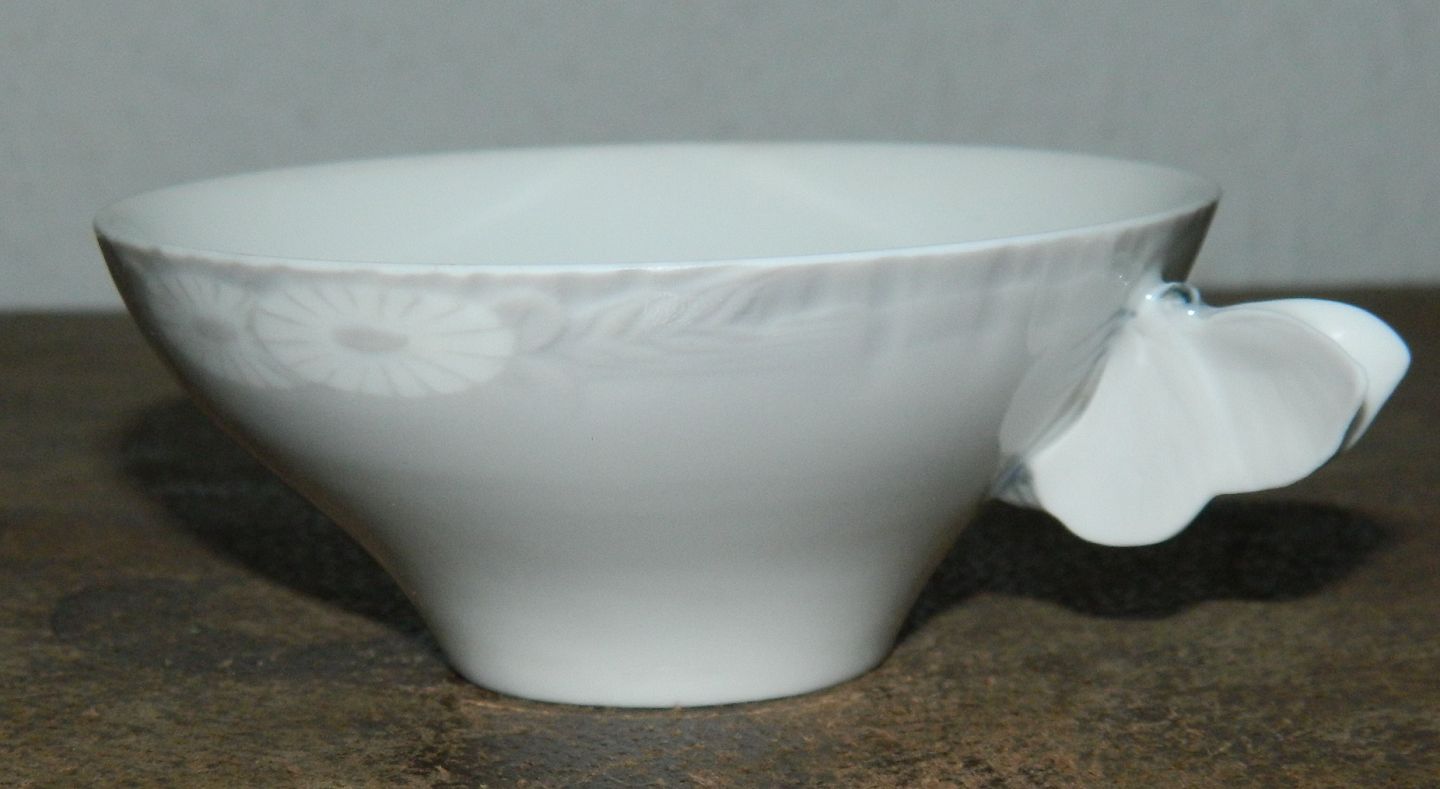 Art Nouveau: "Skærsommernatsdrøm" tekop fra Royal Copenhagen i skønvirkestil med blomsterdekoration samt sommerfugl som hank. Designet af Arnold Krogh. Fremstillet mellem 1923-35. I perfekt stand. Uden skår eller reparationer. 2. sortering. Modelnummer 1370/10072. Mål: H. 4 cm og Ø. 9½ cm