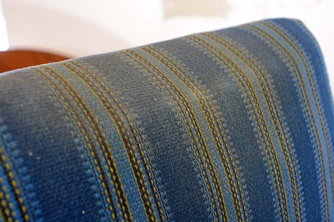 Højrygget læne-/hvilestol model II af Christian Sørensen. Fremstillet hos Gorm møbelfabrik, Aarhus i 1960'erne. Stel af teaktræ. Sæde og ryg med vip. Betrukket med blåstribet møbelstof. Slid i stoffet ved hovedstøtten.