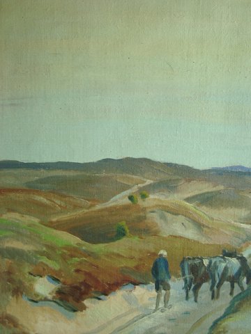 Maleri af W. Winkelmann 1932 - Vej forbi gård med kvæg og mand.
