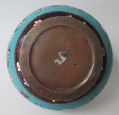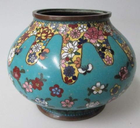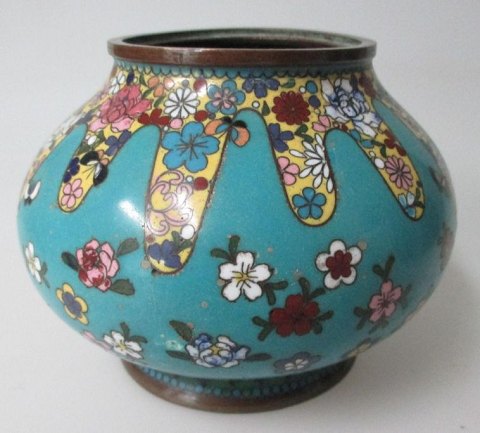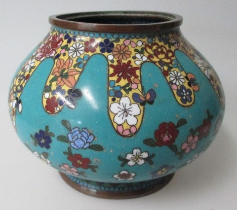 Chinese Cloissonnè vase 19.thC, decorated with flowers and butterflyes. H: 10. cm. Dia.: 12 cm.