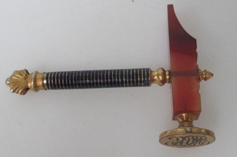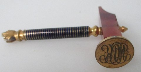 Segl. 1900. Messing med forgyldninger og emaljearbejde. Udarbejdet som en hammer. Hammerhoved i agat og forgyldt messing med emalje. L: 8 cm. B.: 5,7 cm.  Flot stand.