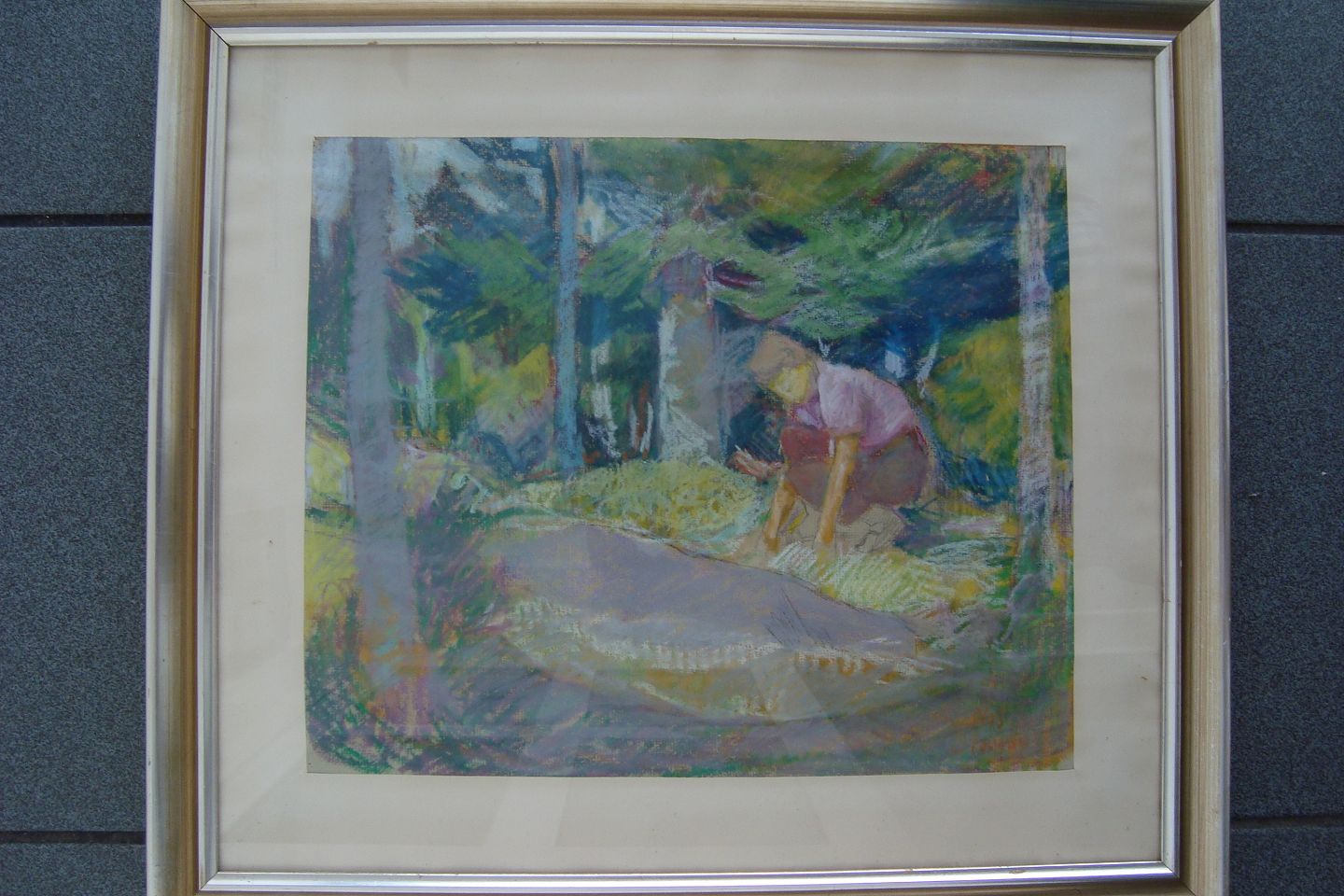 Pastel af Nis Stougaard - Pige ved skovsø 1950'erne.