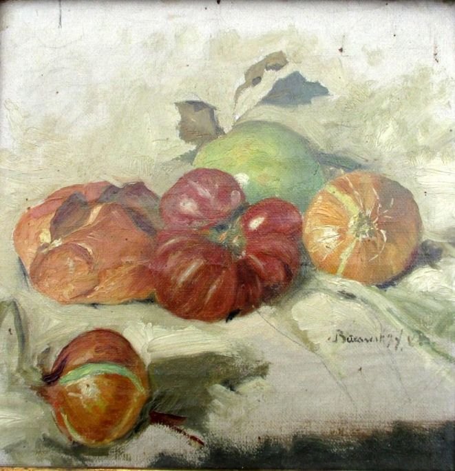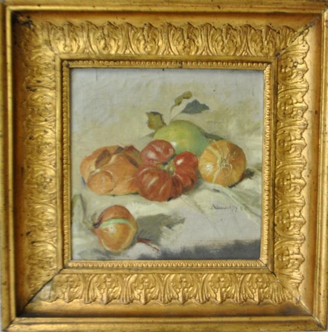 Fransk kunstner: Opstilling med brød, tomater, løg m.v. 19. årh. Olie på lærred/træ. Svært læsbar signatur, dateret 94.