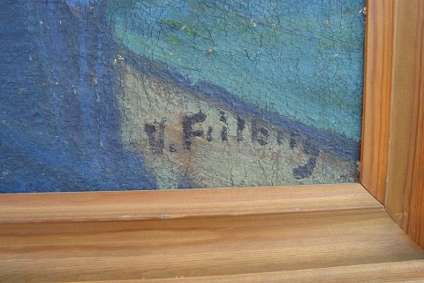 Maleri V. Feilberg - Havneparti med arbejdende fiskere ved deres både.