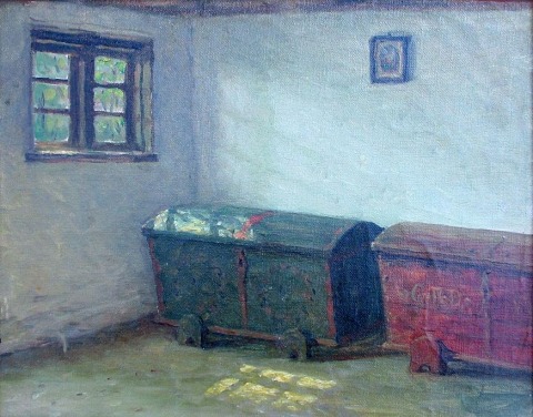 Maagaard, Valdemar (1864 - 1937) Danmark: Bondeinteriør med to standkister. Olie på lærred. Betegnet på bagsiden: Malt af min Far Ove Maagaard. På blændrammen endvidere stempel fra V. Maagaards dødsbo auktion. 27 x 34 cm.
