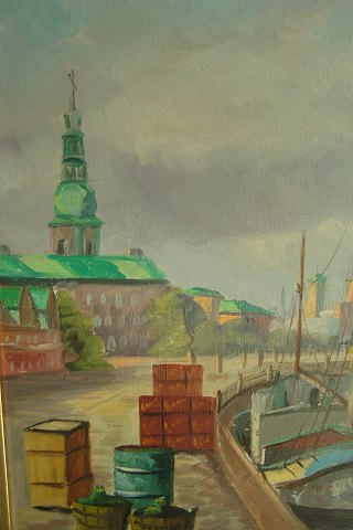 Maleri - Parti fra Slotsholmskanalen med Børsen, Christiansborg Slot og Holmens Kirke (Bremerholm).