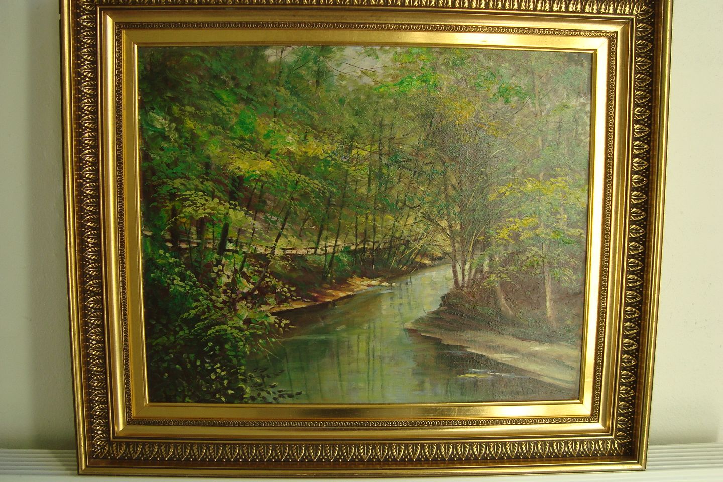 Maleri af Chr. Dybdal - Skovparti med åløb 1973.