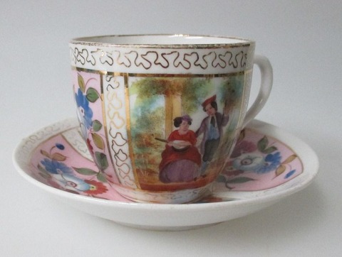 Tysk porcelæns kop med bemalinger, 19. årh. Med underkop. Kop dekoreret med blomster og musik scener. Med forgyldninger. Højde kop: 6,4 cm. Dia. underkop: 12,2 cm.