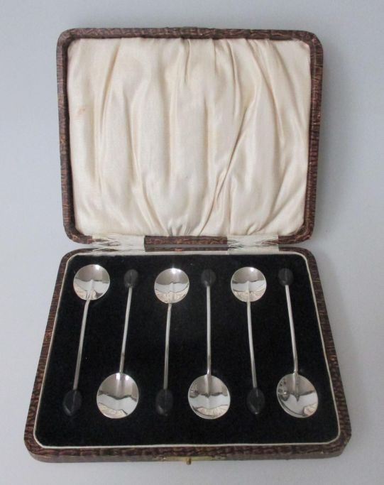 2 Æsker med 12 theskeer i sølv, med kaffebønner som skaft, 19. årh. England. L:  9,3 cm.