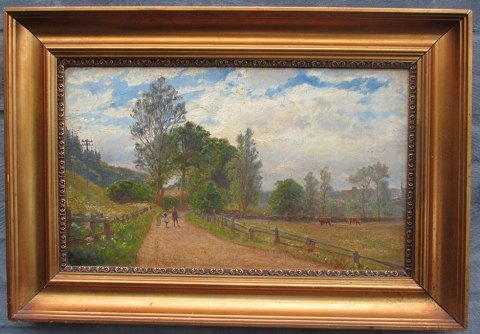 Langer, Viggo (1860 - 1942) Danmark: To børn på en vej. Olie på lærred. Signeret: Viggo Langer juni 1906. 31 x 52 cm.