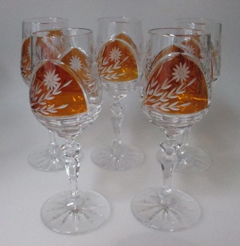 5 Bømiske krystal hedvins glas, 20. årh. Med slibninger i gult overfang. H.: 16,5 cm.