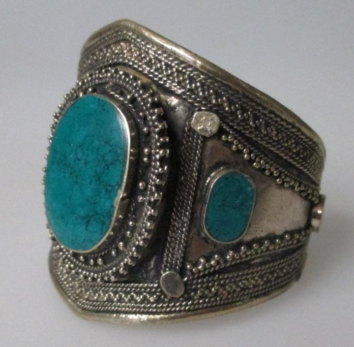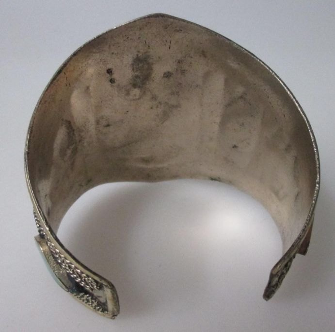 Afghansk arm bånd, 20. årh. Forsølvet metal. Med dekorationer og malakit. H: 10 cm. Dia.: 6 cm.