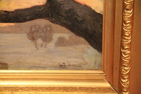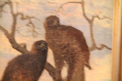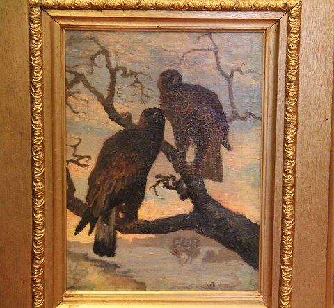 Maleri Rovfugle på gren Oliemaleri på Lærred ca 60 x 49 cm inklusiv original guldramme Vilhelm Th. Fischer 1857 - 1928