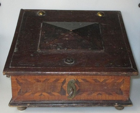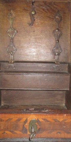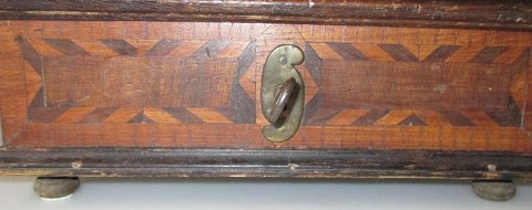 Barokt skrive skrin med skrå klap, 18. årh. Danmark. Poleret egetræ. Med intarsia. Med lille læddike. Rococo beslag i jern. Nøgleskilt i messing. Jernlås. Forsynet med hemmeligt rum. H.: 23 cm. B.: 30 cm. D.: 21,5 cm.