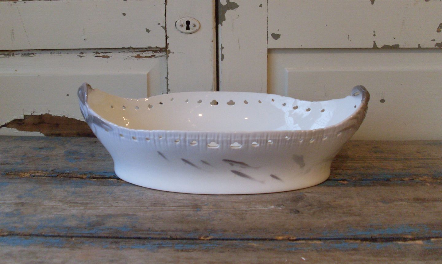Royal Copenhagen stor Art Nouveau jardinere med gennembrudt kant, dekoreret med fisk, samt hanke i form af krabber.