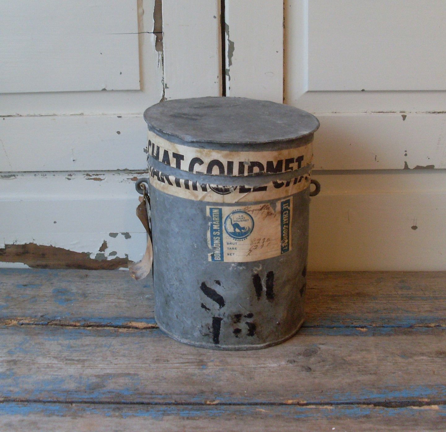 Gammel fransk zink dåse med teksten "Le chat gourmet" gourmet katte mad.
