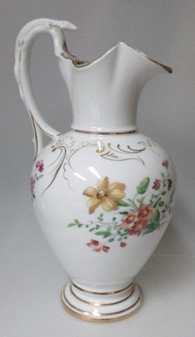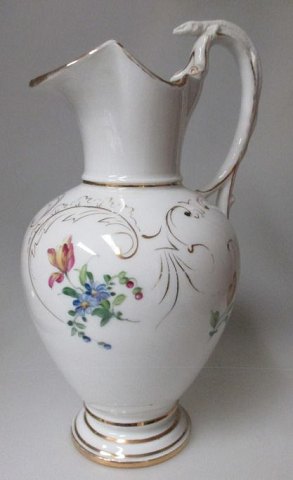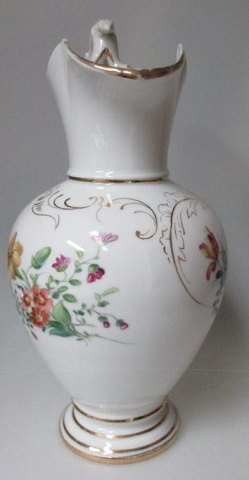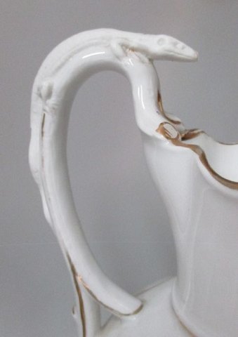 Bing & Grøndahl chokoladekande, 19. årh. København, Danmark. Håndmalet med strøblomster og forgyldninger. Hank i form af salander i bisquit. H.: 27 cm. Stemplet.: BG.