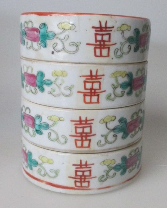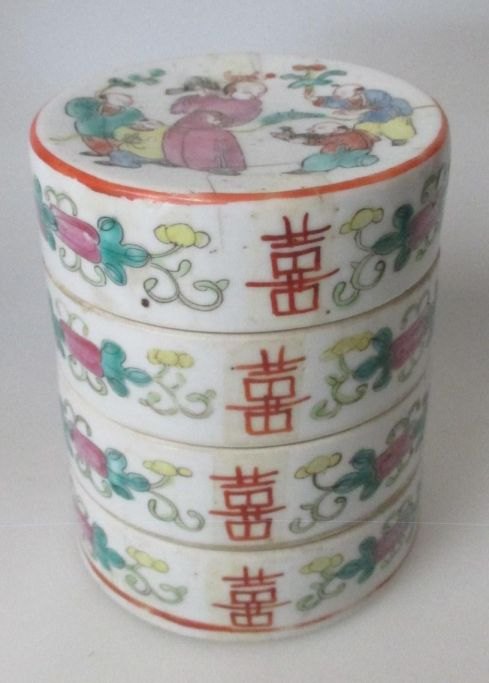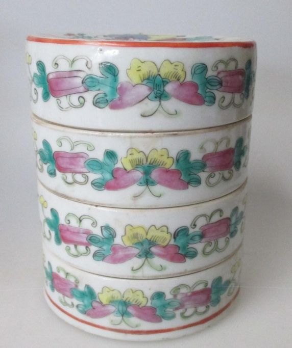 Chinese food container, famille rose, 4 parts, 19th century. Cylinder shape. Polychrome decoration with flowers, butterflies and 5 people. Overall height .: 11 cm. Dia: 9 cm. With characters on the sides.