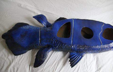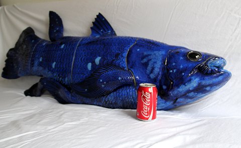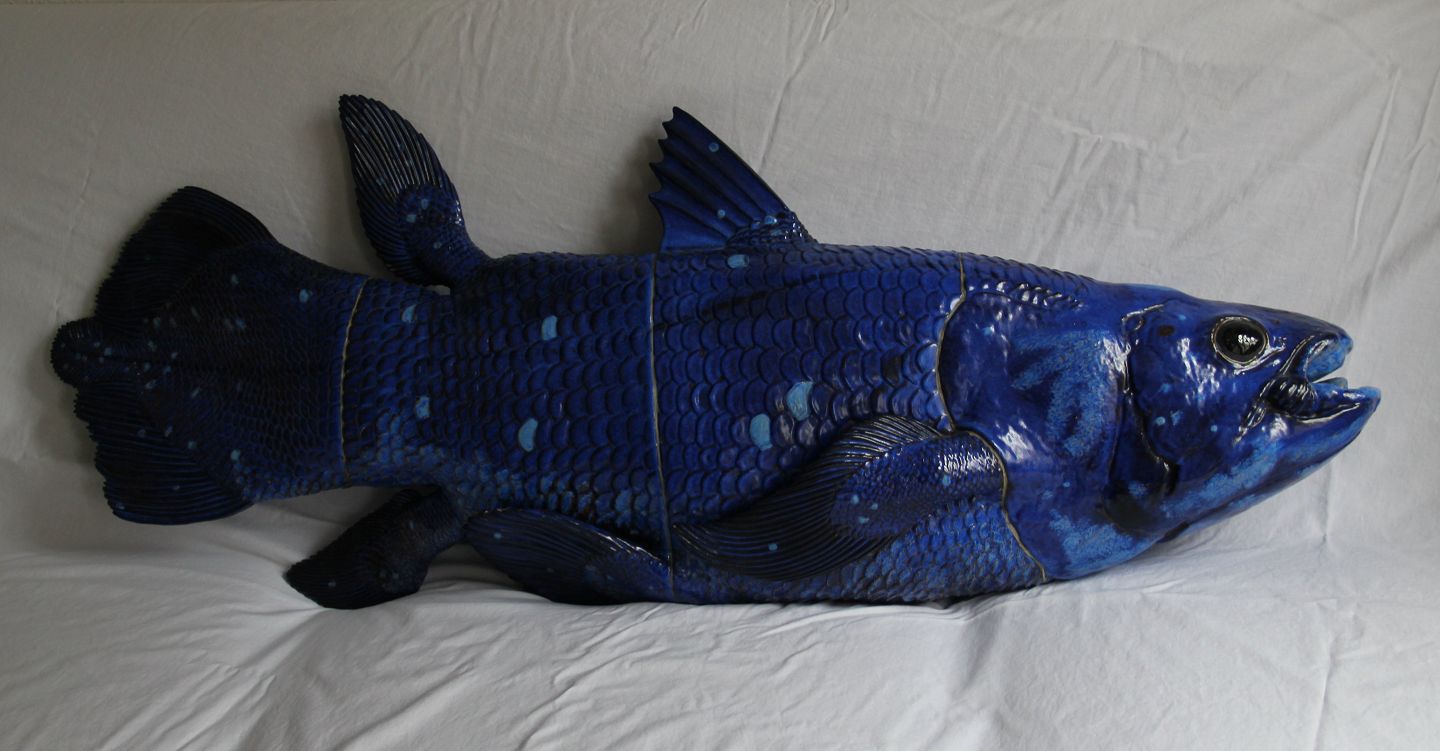 Billedhugger Jeanne Grut har ladet sig inspirere af Coelacanthen og har modelleret en relief skulptur af denne fisk. Det blåglaserede stykke giver beskueren et overvældende indtryk af en forunderlig ting - et levedygtigt fossil - en virkelig fabelfisk - ­en dyrefigur, som næsten må have levet siden verdens skabelse
