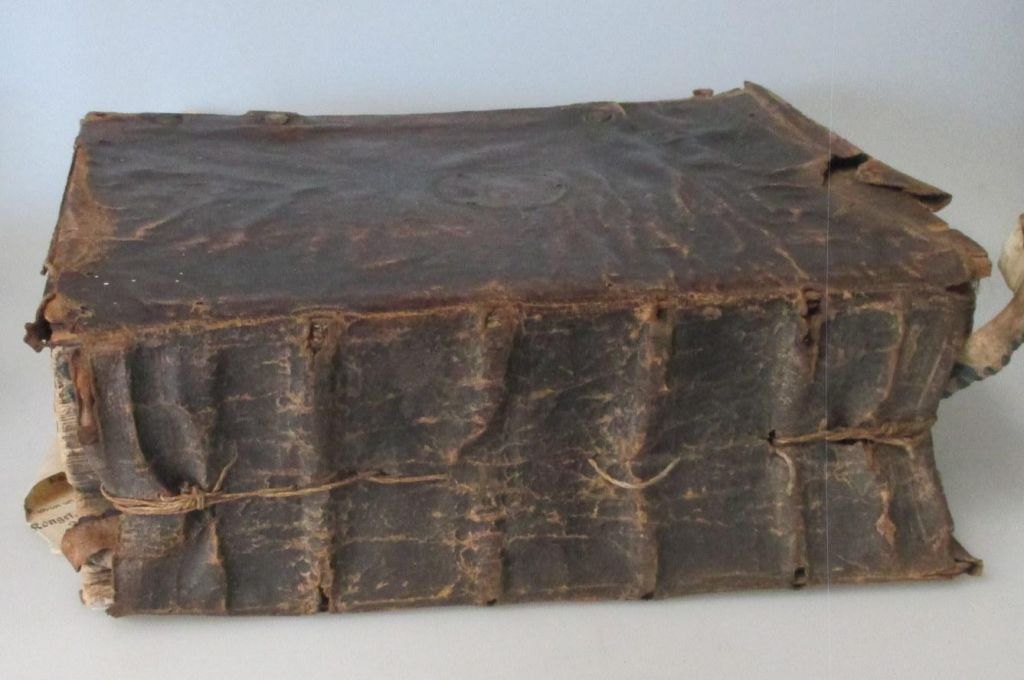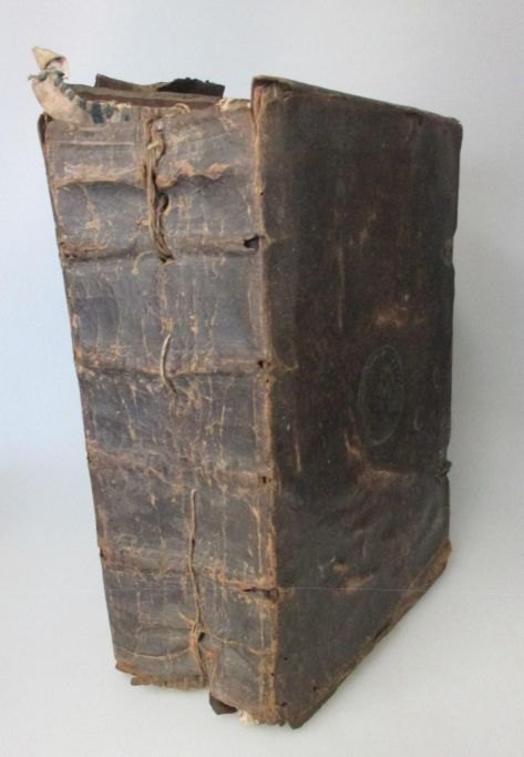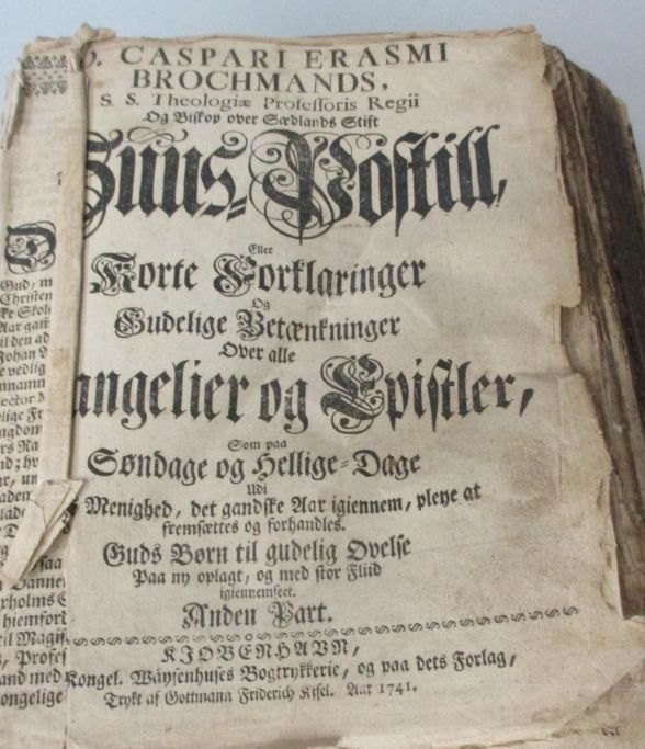 D. Caspari Erasmi Brochmands "Huus-Postill". 2. Part. København 1741. Med ældre slidt læderindbinding med messingskilt. 25 x 21 cm.  Meget slidt. Udlånt til TV antikprogrammet Krejlerkongen 2020.