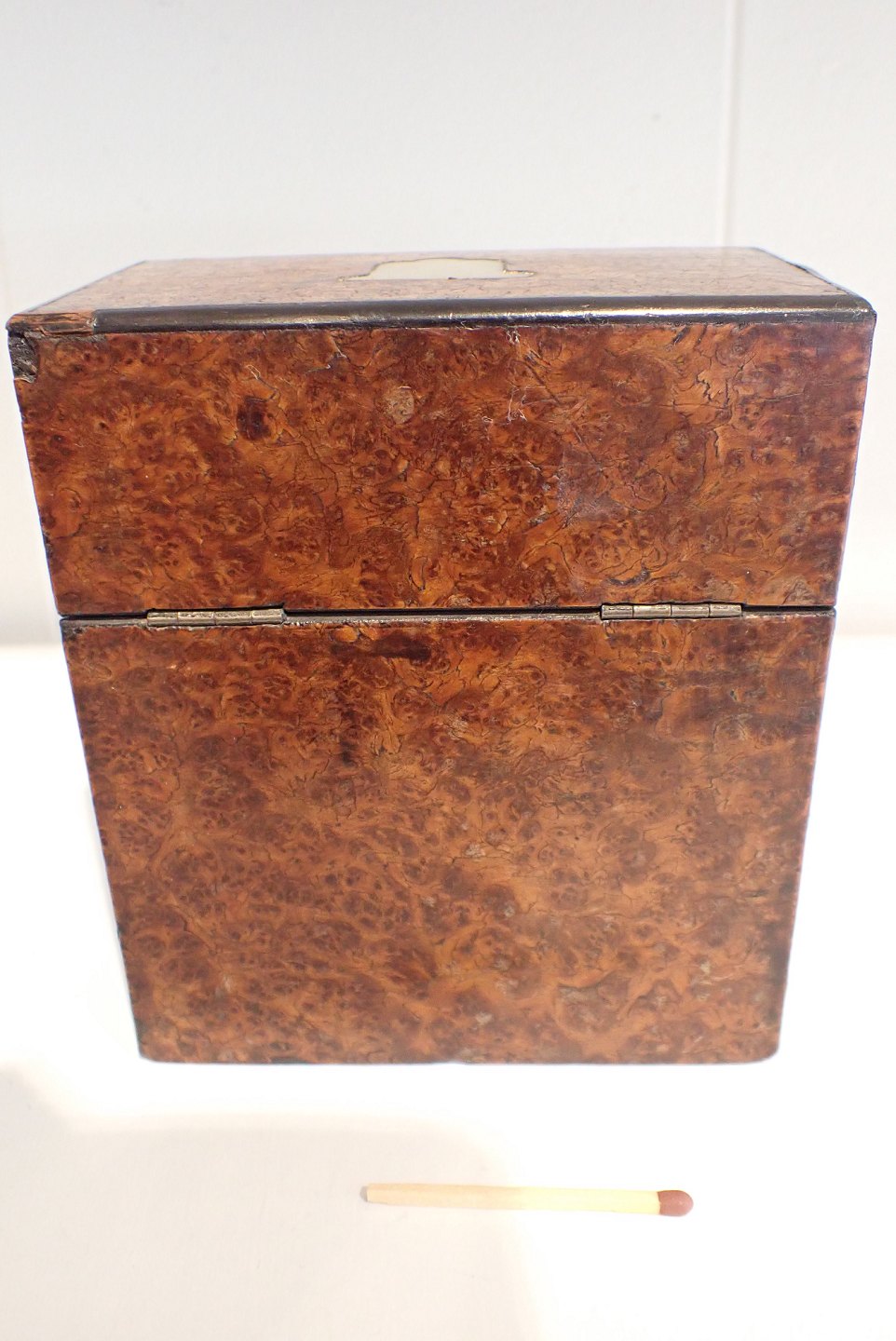 Lille foret skin i fugleøjetræ med messing ved nøglehul og som skjold på låg. Nøgle mangler. Indeholder to miniature karafler med glasproppe - ikke ens og formentlig den ene ikke original til skrinet. Lille skår i kraven på begge karafler. Mål: 12,5 x 11 x 6,4 cm.