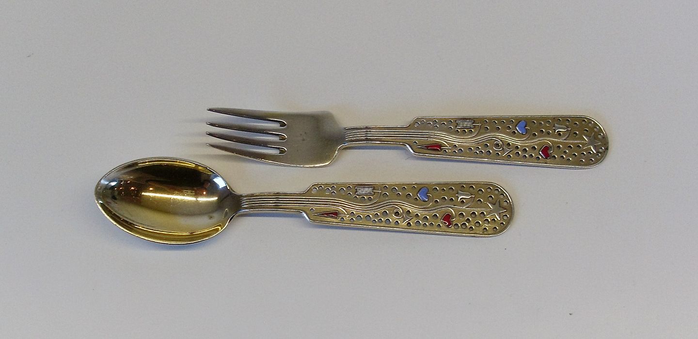 A. Michelsen jule ske & gaffel i forgyldt sterlingsølv og emalje fra 1939