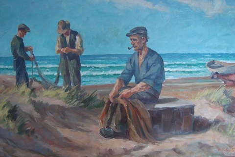 Maleri af Christian Aabye-Talge - Fiskere rengør garn på stranden.