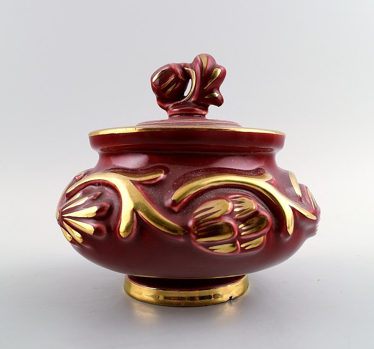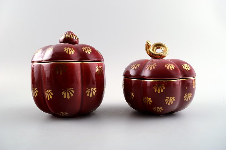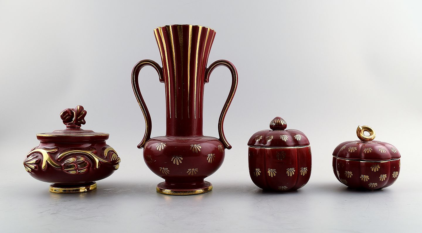 Samling 'Rød Rubin' af keramik med rød glasur med guldkant, fremstillet hos Upsala-Ekeby, Gefle. Design Arthur Percy.