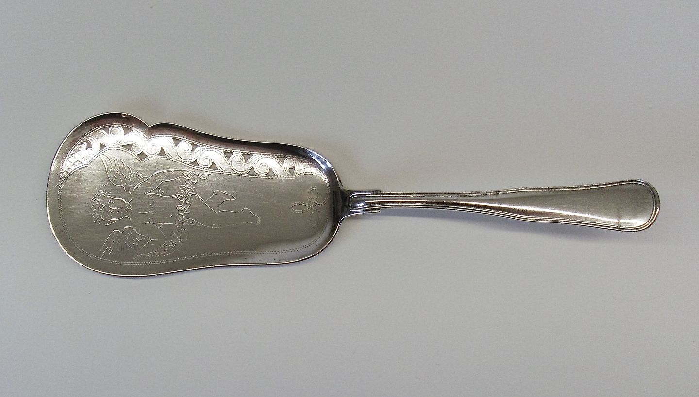 Antik Dobbeltriflet fiskespade smukt dekoreret med en engel med blomster krans.