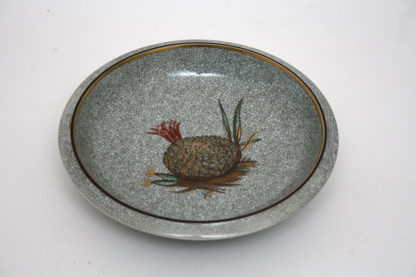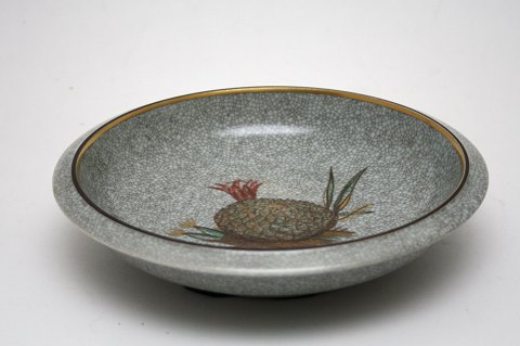 Royal Copenhagen, Krakelé skål motiv måske en ananas. Dek.nr. 444/2526. II. sortering. Diameter 21 cm. Højde 4,5 cm. Pris: 375 kr.