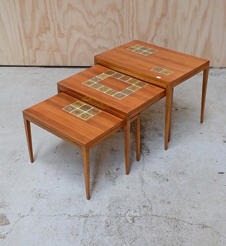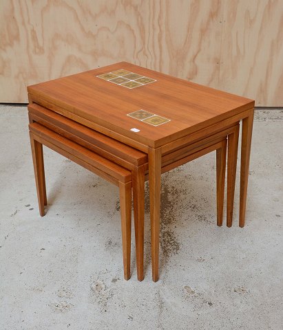 Et sæt Indskudsborde i teaktræ med gyldne kakler med forskellige motiver designer af Bjørn Wiinblad. Kaklerne på bordet er en del af i serien "Quatre Couleurs". Fremstår med meget få brugsspor - ridser.
