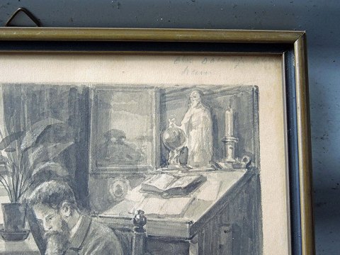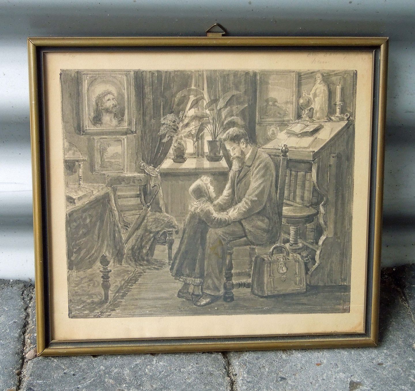 Indrammet radering med motiv af stuemiljø med mand og barn