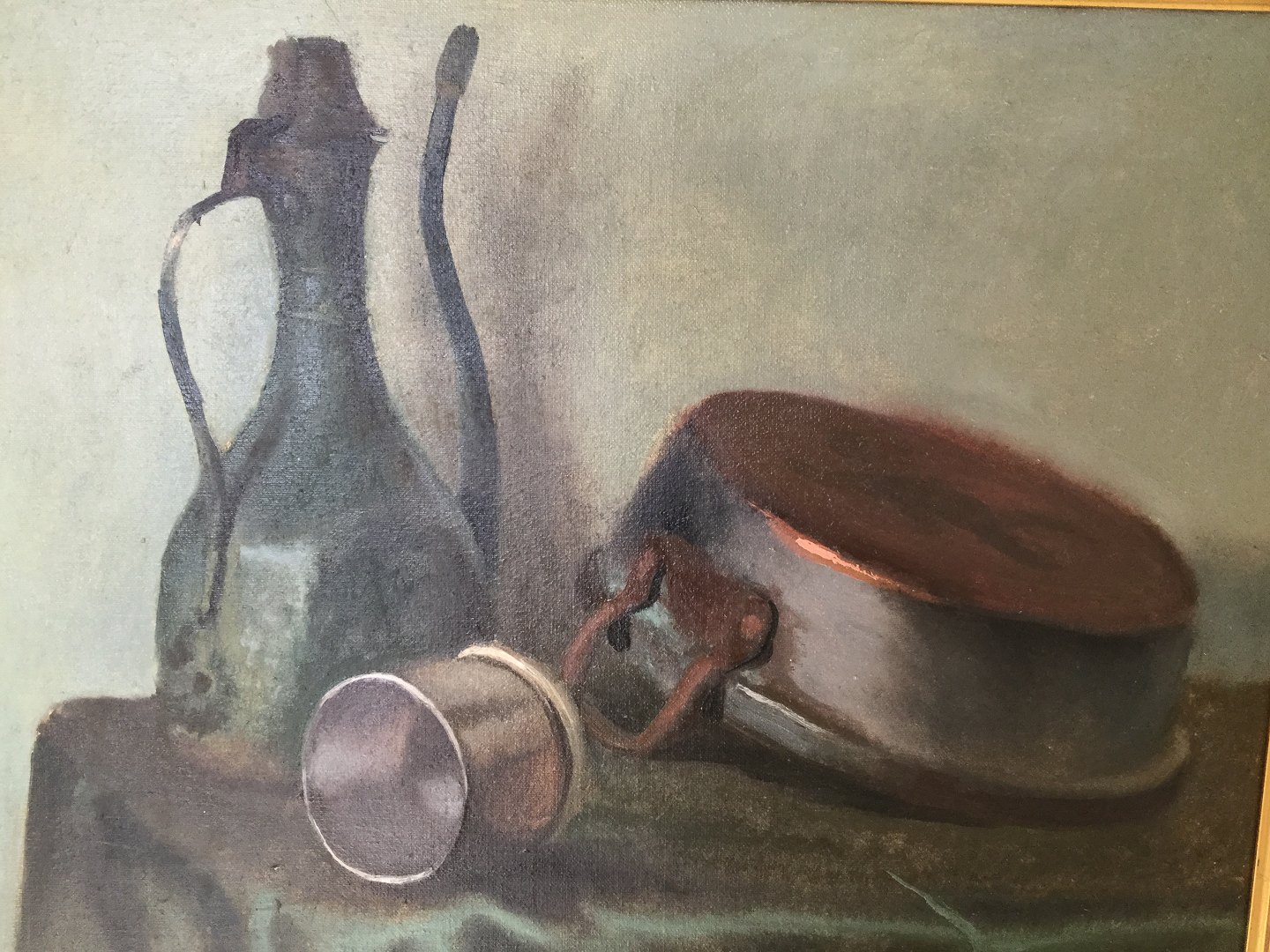 Maleri af Witold Wisniewski - Opstilling på bord med kobbertøj.