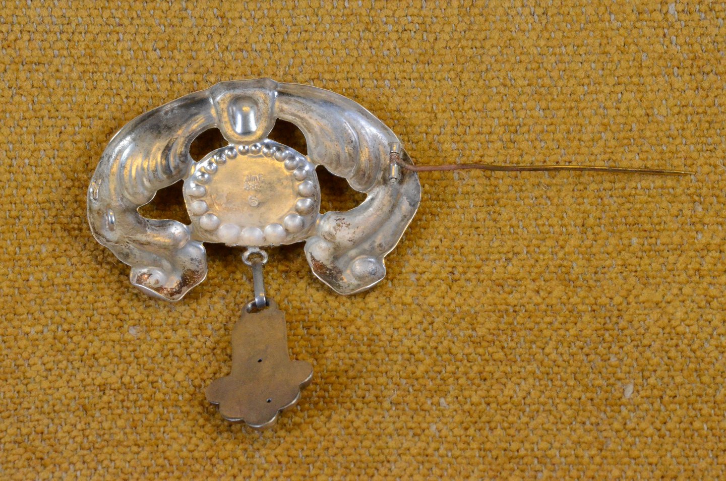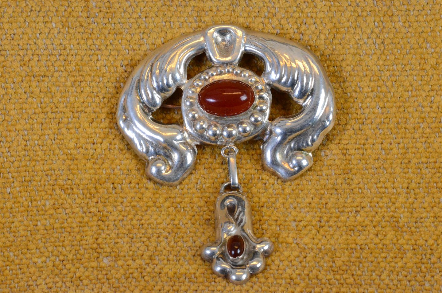 Broche skønvirke i organisk mønster med perle af brun agat i center af brochen og af vedhænget. Stemplet 830. Art No. 5