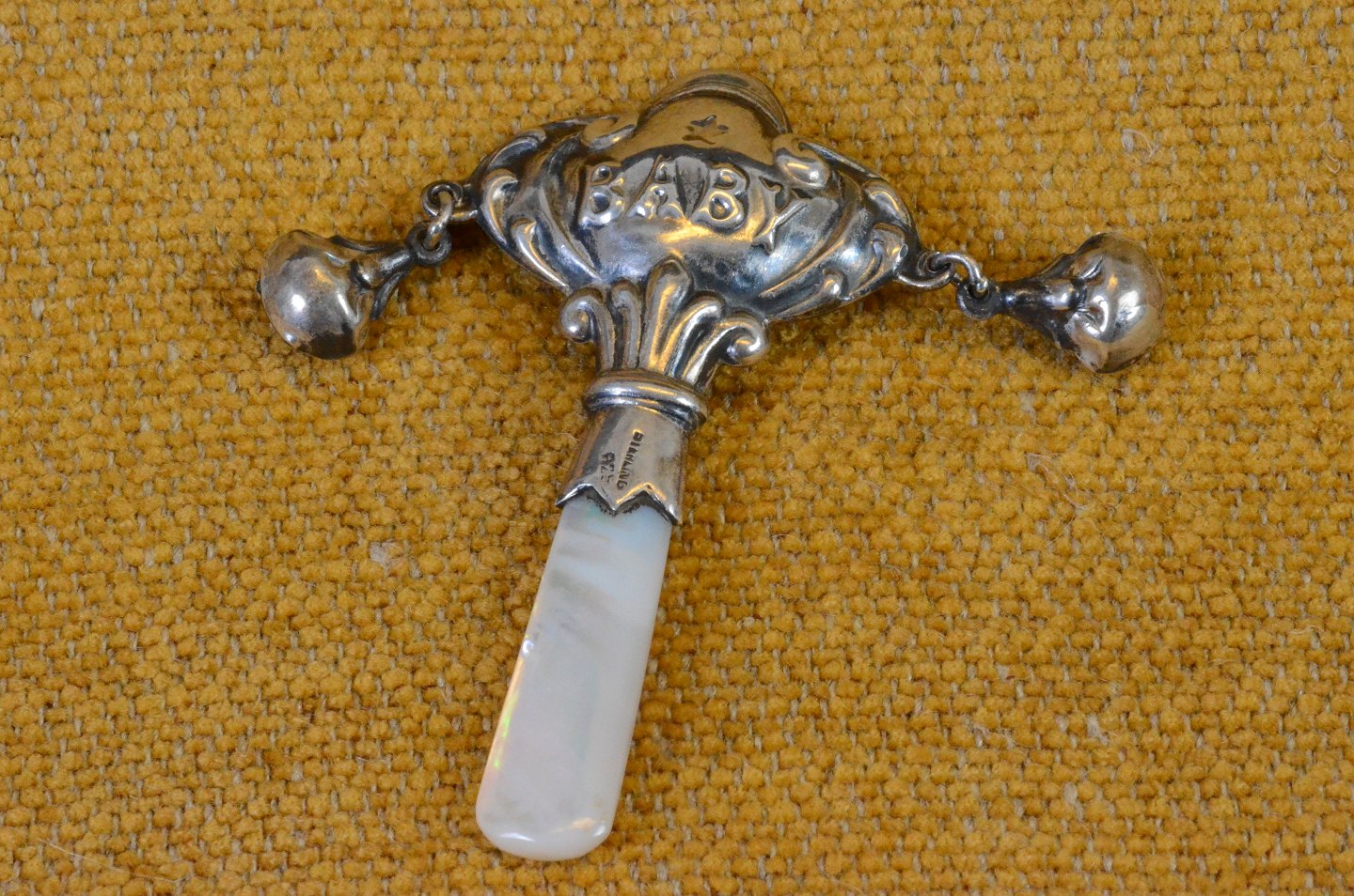 Rangle i sølv med perlemors skaft, 2 små sølvklokker. Ordet "BABY"indgår som en del af dekorationen. Sterling sølv. Art No. 6