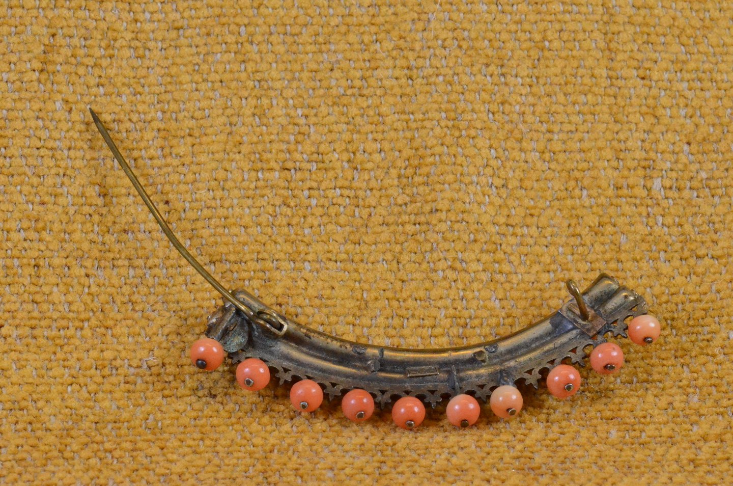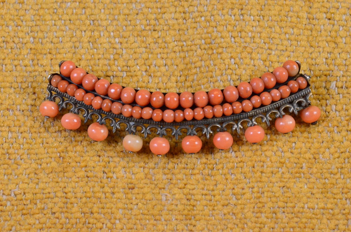 Broche med koralperler monteret på messing i 2 rækker, afsluttet med dekorativ kant prydet med 10 koralperler. Str. 6,5*1,8 cm. Art.No.23