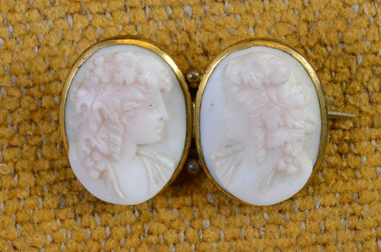 Camé 2 spejlvendte hoved skåret af hvid koral med rosa stænk og monteret i forgyldt ramme. Smykker er en broche. Str.: 2 * 3,0 cm. Art No. 27