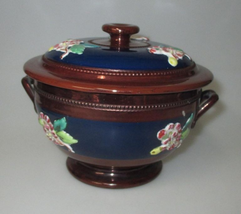 English luster tureen with lid, 19th century. Glaze with blue, decorated with flowers. With handle. H .: 13 cm. Dia .: 17.5 cm.