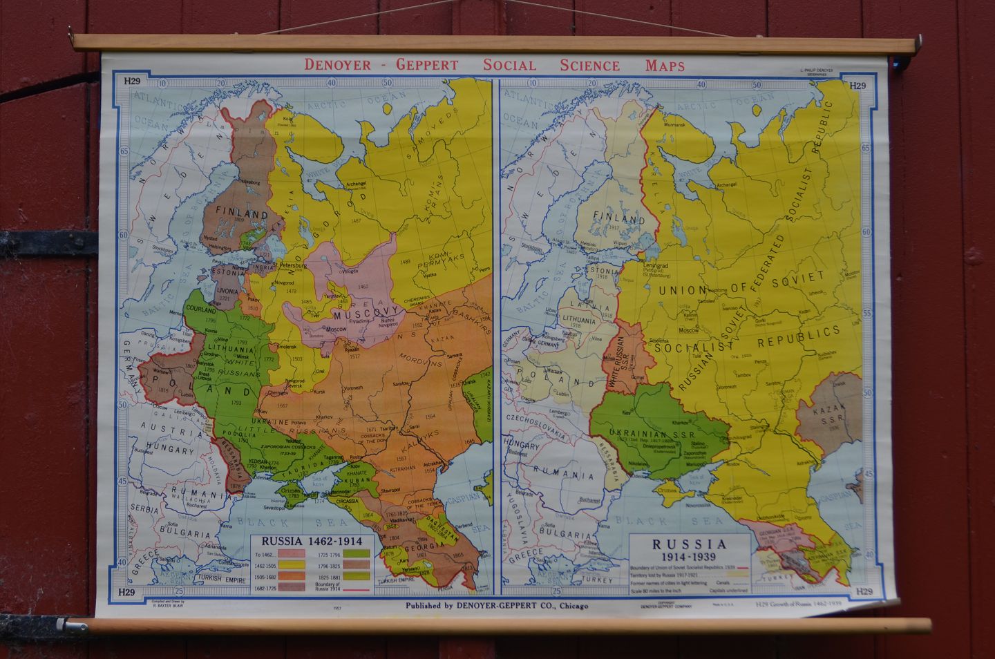 Skolekort, Engelsk: Rusland 1462-1914 og 1914-1939, Transportabelt med træstokke, Kortmål: 110 x 80 cm, (Skolekort nr. 7)