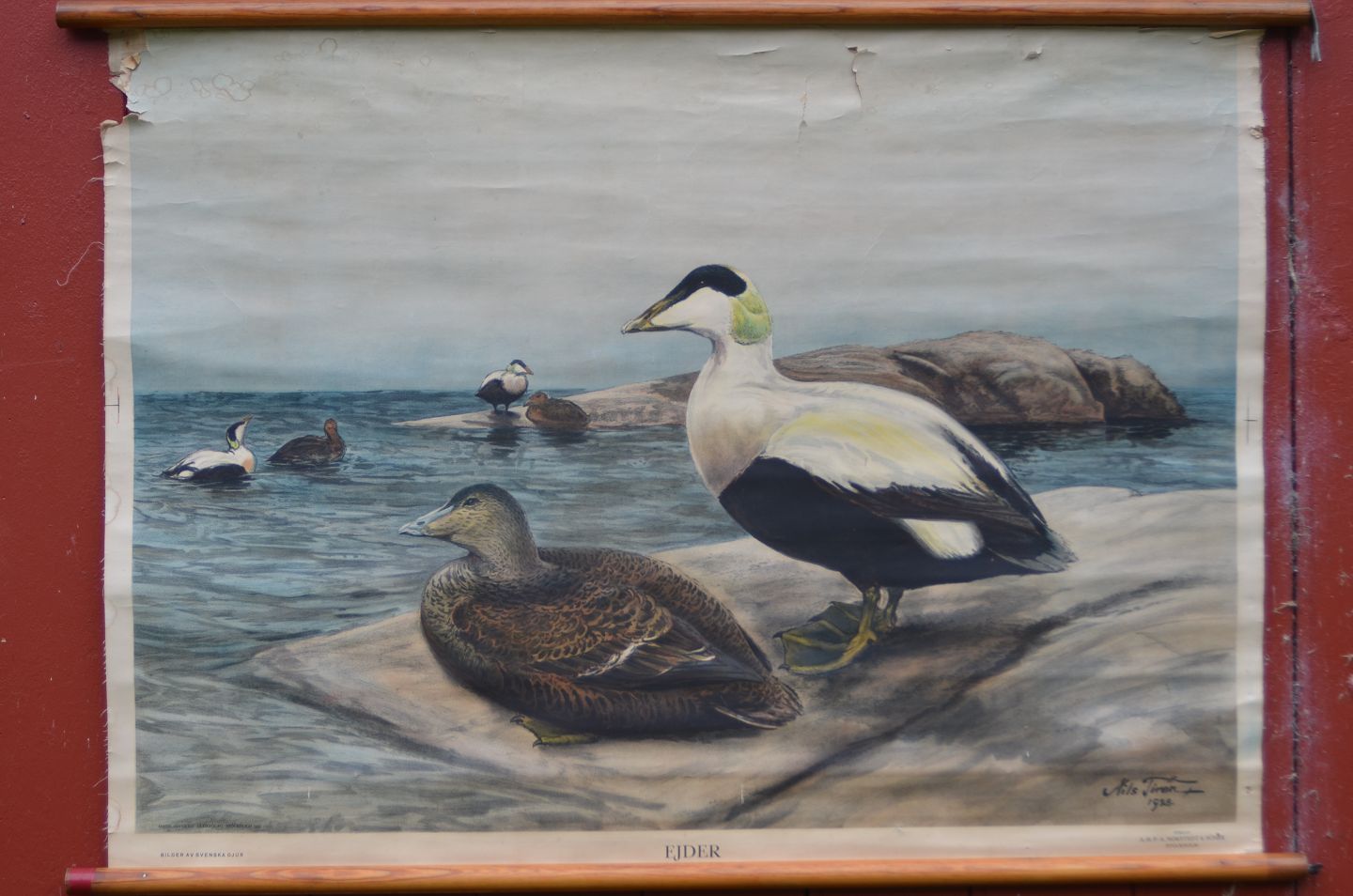 Anskuelsestavle med træstokke: Edderfugle, Billedmål: 70 x 98 cm, (anskuelsestavle nr. 15)