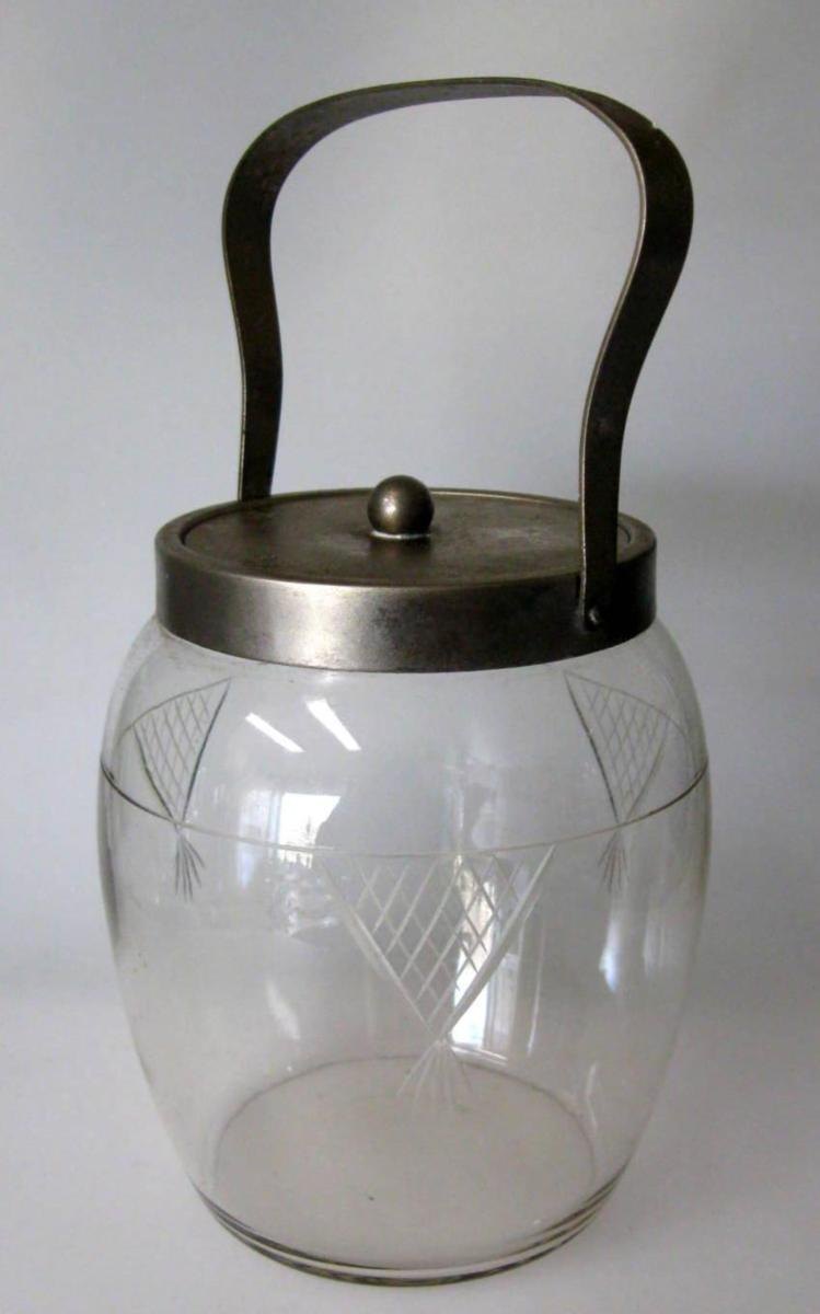 Kiksespand i klart glas med slibninger, o. 1900. Med låg og hank i metal. Højde: 15,5 cm. Højde til hank: 23,5 cm.