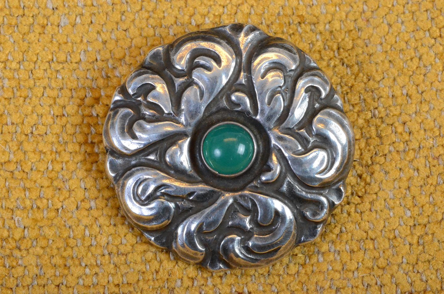 Broche skønvirke sølv lukket bagside, dekoreret med grøn agat. Stemplet 830S "ECW". Diameter 4 cm. Art No.: 38