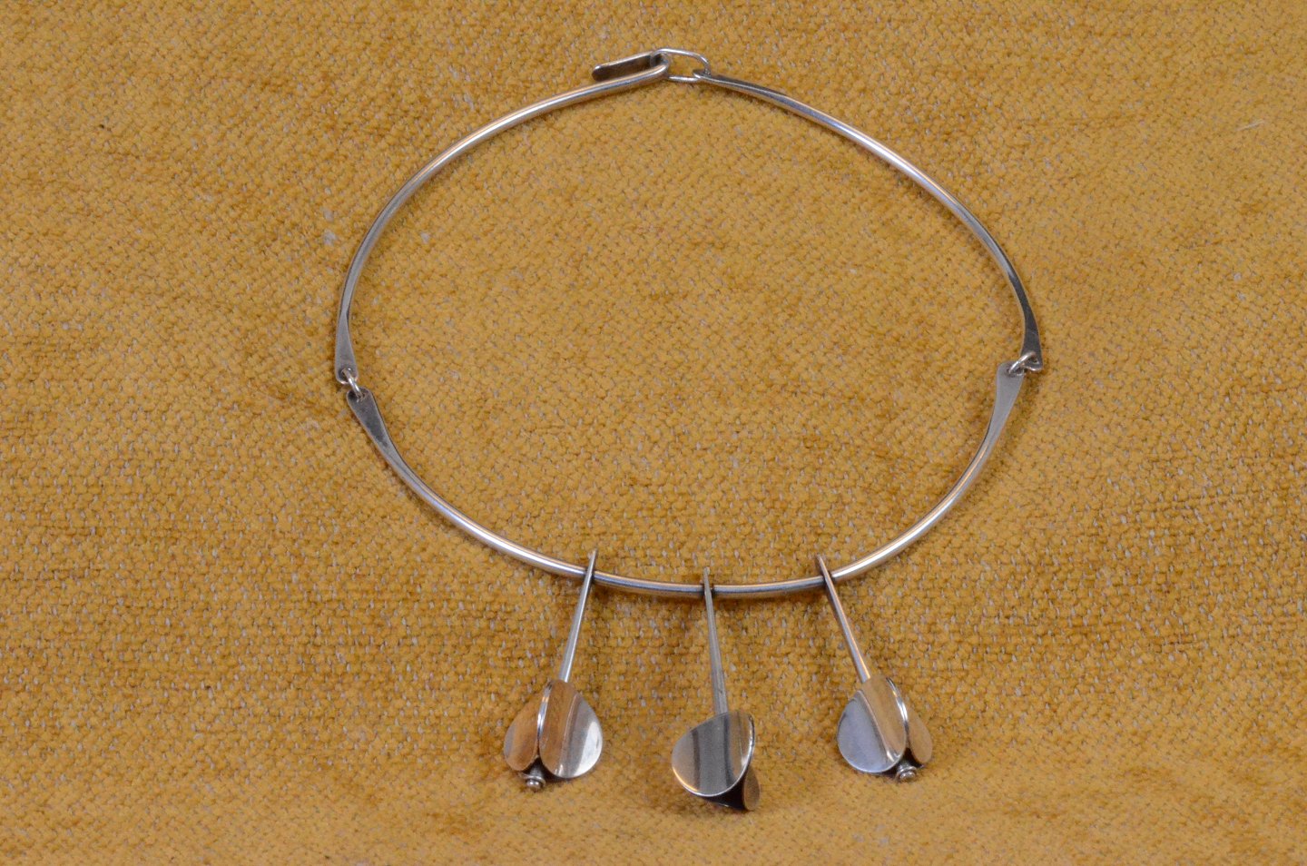 Halsring i sølv med 3 vedhæng formet som bøgens bog på stilke. Stemplet 925 A.Michelsen Denmark. Diameter 11 cm. Art No. 54