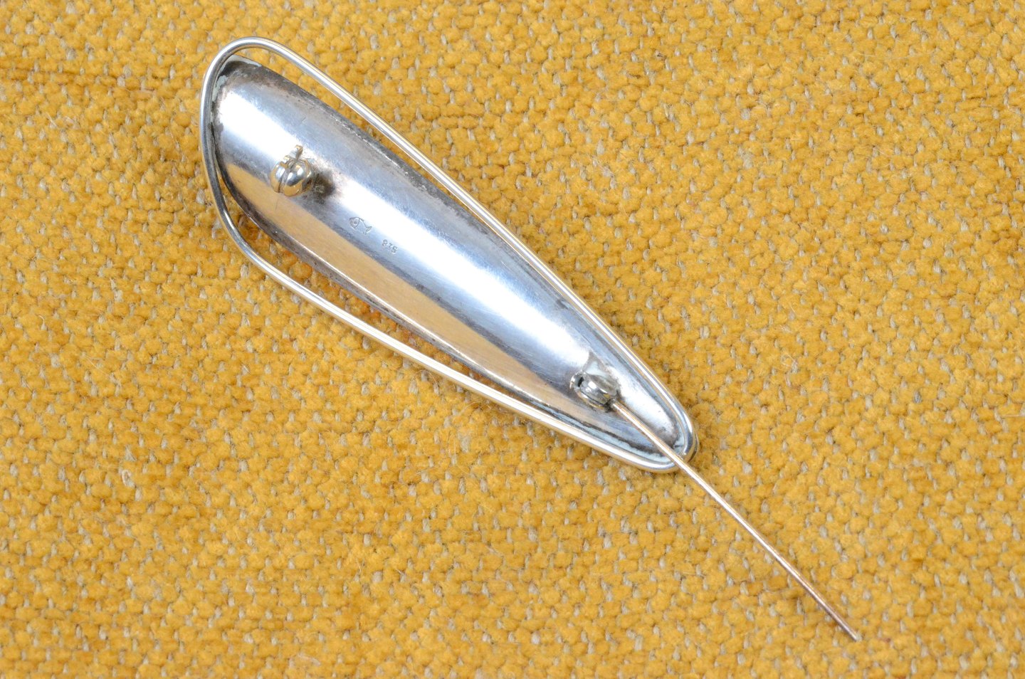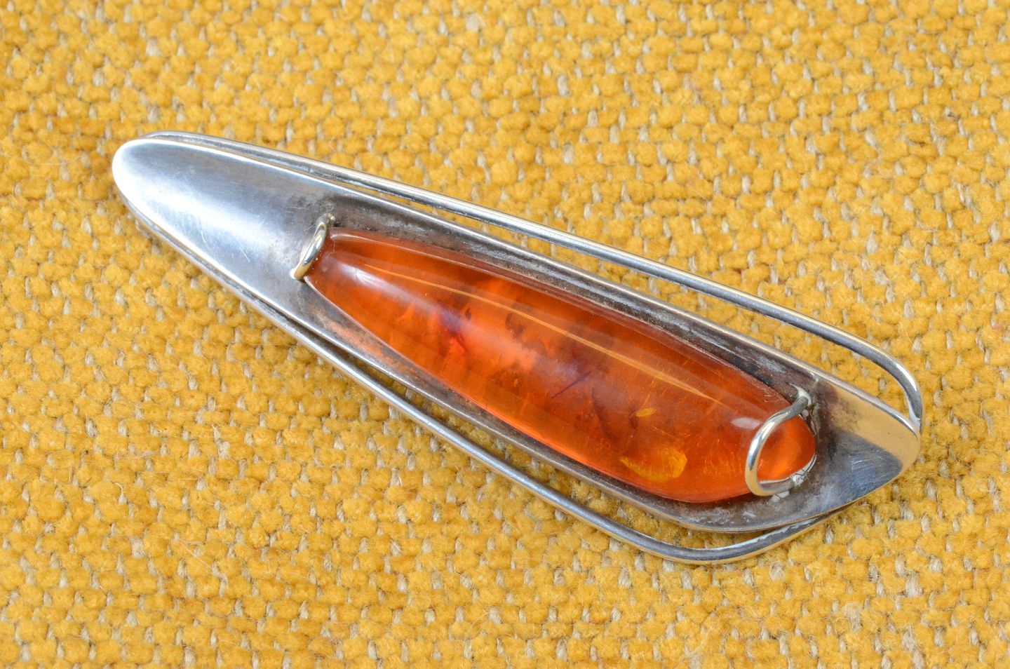 sølv broche med rav. Stemplet en fisk og 835. Str.: 6,5*2 cm. Art No. 64