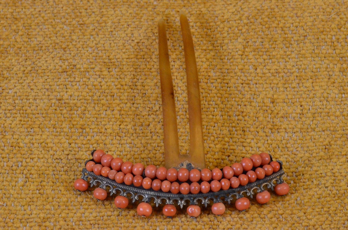 Hårnål af horn med koraler i 2buet rækker, smukt udskåret sølvrække prydet med 10 større koralperler. Str.: 6,5*1,8 cm, nålene 7 cm. Art.No. 103