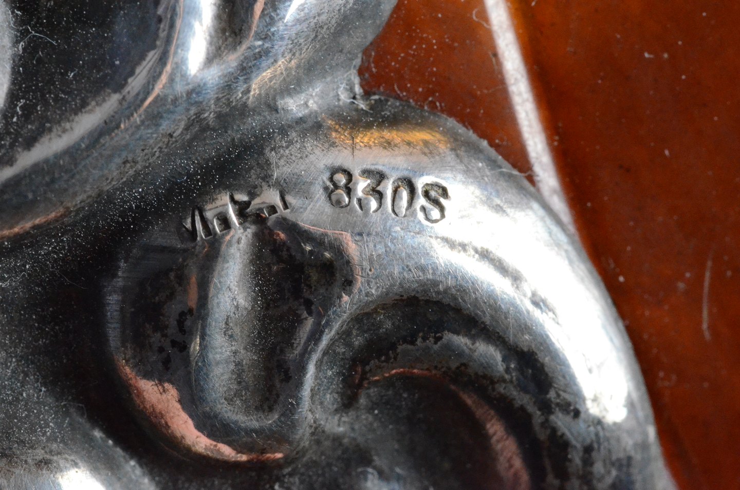 Hårkam skønvirke, skildpadde og sølv prydet med cabochonsleben rav 20. årh.s begyndelse. Stemplet 830S og utydeligt mærke. Str.: 13 * 4 cm, kam 11 cm. Art. No. 104