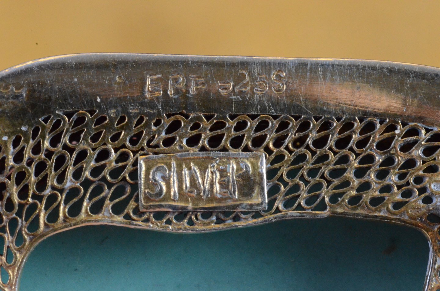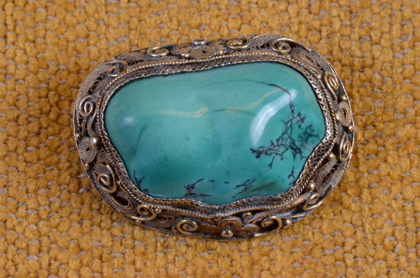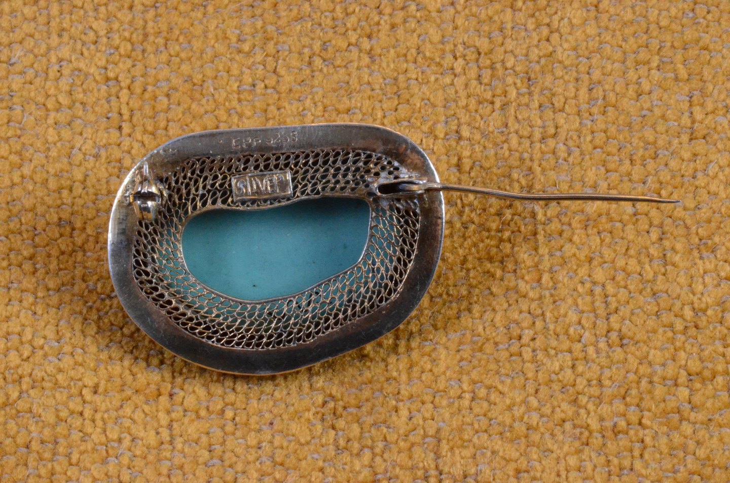 Broche med stor tyrkis monteret i dekorativ ramme. Stemplet 925 EPF (Erik Poul Fenster - Hellerup 1951 - 1997). Art. No. 122