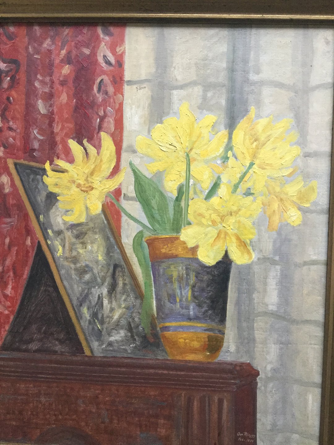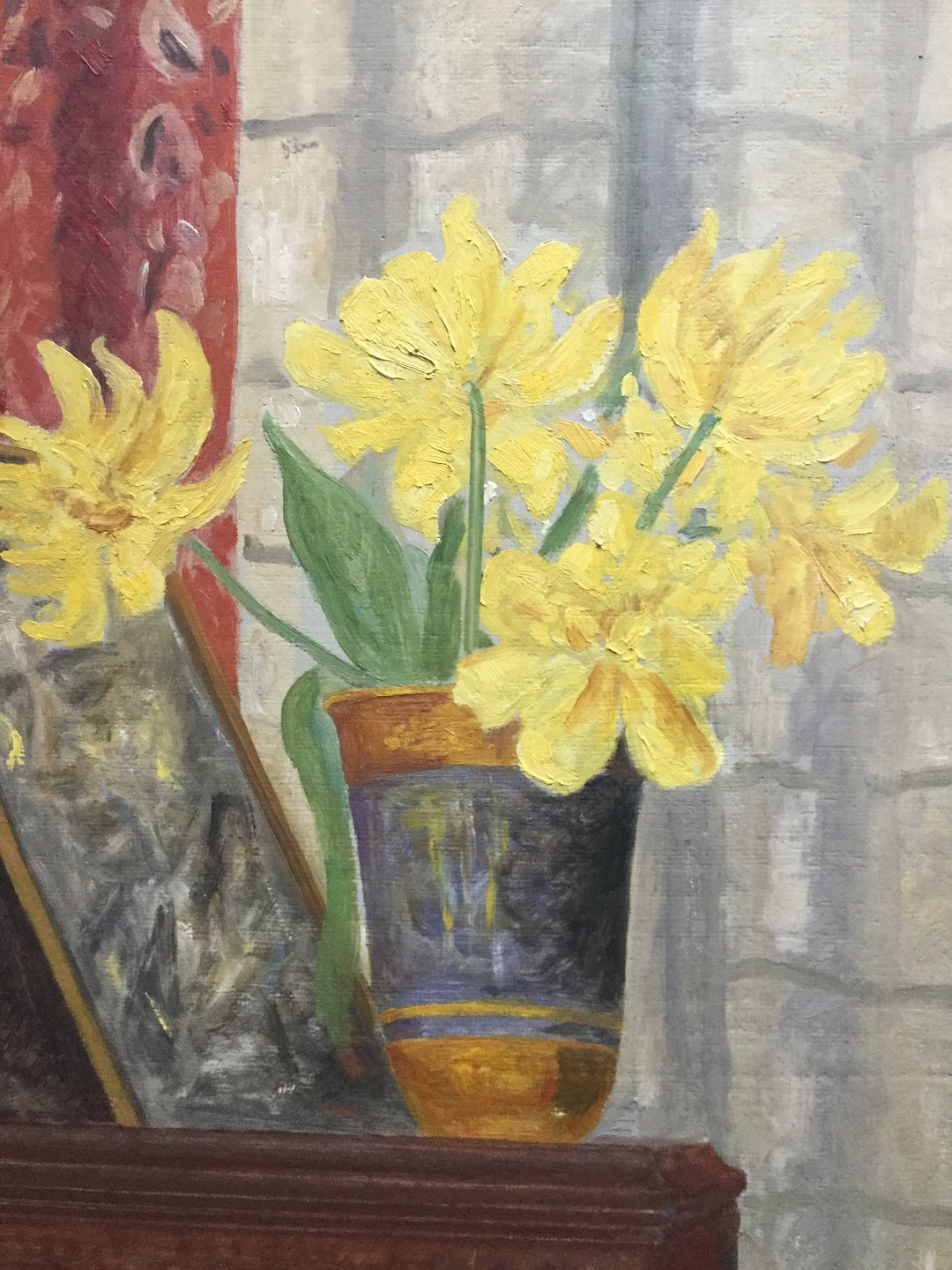 Opstilling på kommode med gule tulipaner i vase 1936.
